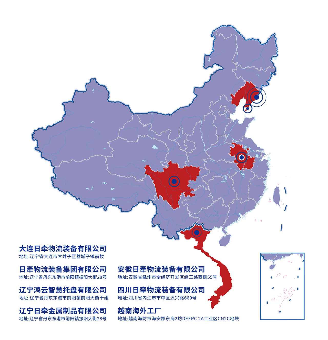 日牵集团作为中国知名物流装备制造企业,始建于1995年,专注于单元化物流载具与包装。坐拥大连、丹东、安徽、四川、越南七大自动化、智能化制造基地;生产占地总面积超过 358,000 平方米,超 2,300 名员工,年产量超40万吨。客户遍布全球,80% 的产品出口到日本、美国和欧洲国家。
