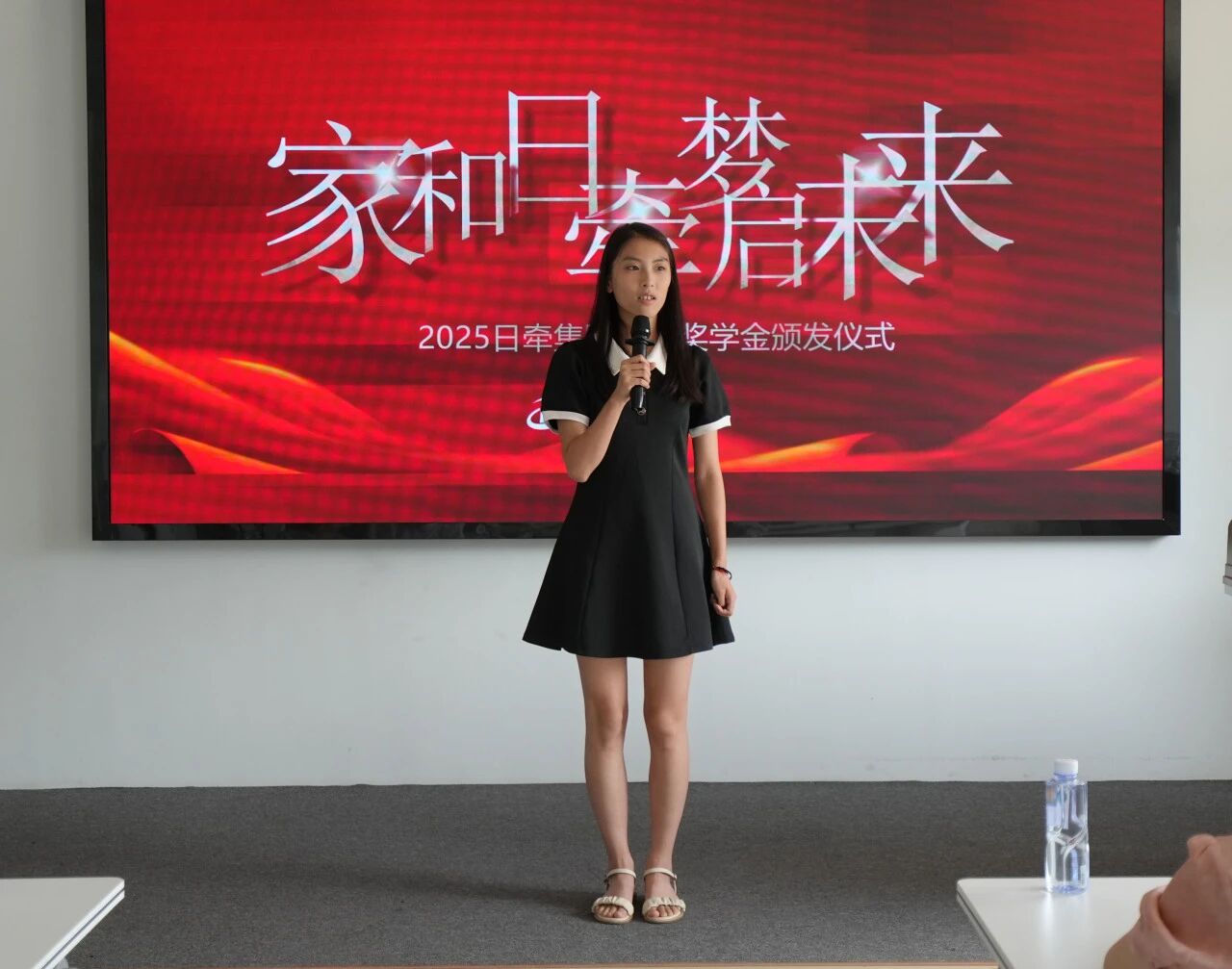 日牵集团总裁赵宇芳女士向2025年日牵的考生家庭表达祝贺,并向领取第一届奖学金的考生代表讲述了“家和日牵基金”的发起,以及日牵集团对于日牵家人上一辈、下一辈的关心、关爱。