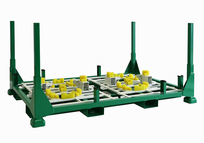 Modular steel structure; easy tray assembly/disassembly; recyclable cost-saving; foldable with stacking feet; forklift compatible.